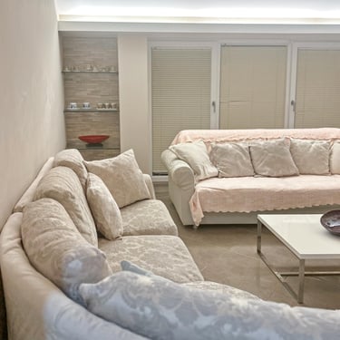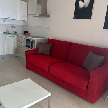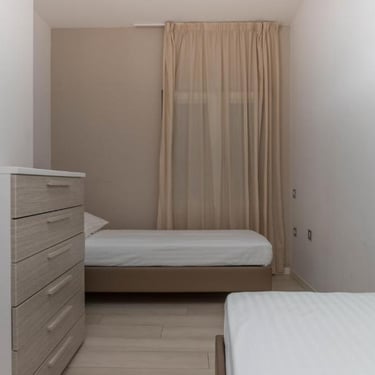 Prostrani obiteljski apartman od 140 m² s tri odvojene spavaće sobe, svaka s vlastitom kupaonicom. Dnevni boravak nudi kutnu garnituru i sofu na razvlačenje te dodatni toalet.