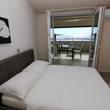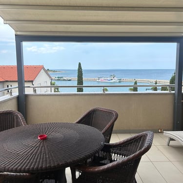 Balkon nudi prekrasan pogled na Jadransko more i cijeli resort – savršeno mjesto za opuštanje u svako doba dana.