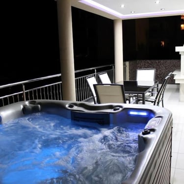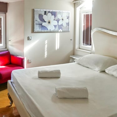 Dvije sobe opremljene su bračnim krevetima (160x200), dok treća ima dva odvojena kreveta. Poseban doživljaj pruža veliki balkon s blagovaonskim stolom, privatnim jacuzzijem i BBQ-om (na zahtjev), uz prekrasan pogled na Jadransko more, bazen i cijeli resort.