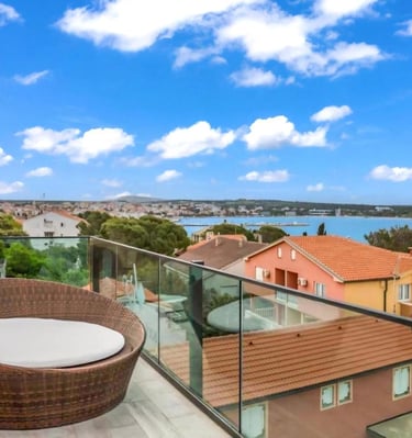 🌊 Vidik na Jadran – prostrane terase i balkoni s panoramskim pogledom na more, otoke i Velebit.